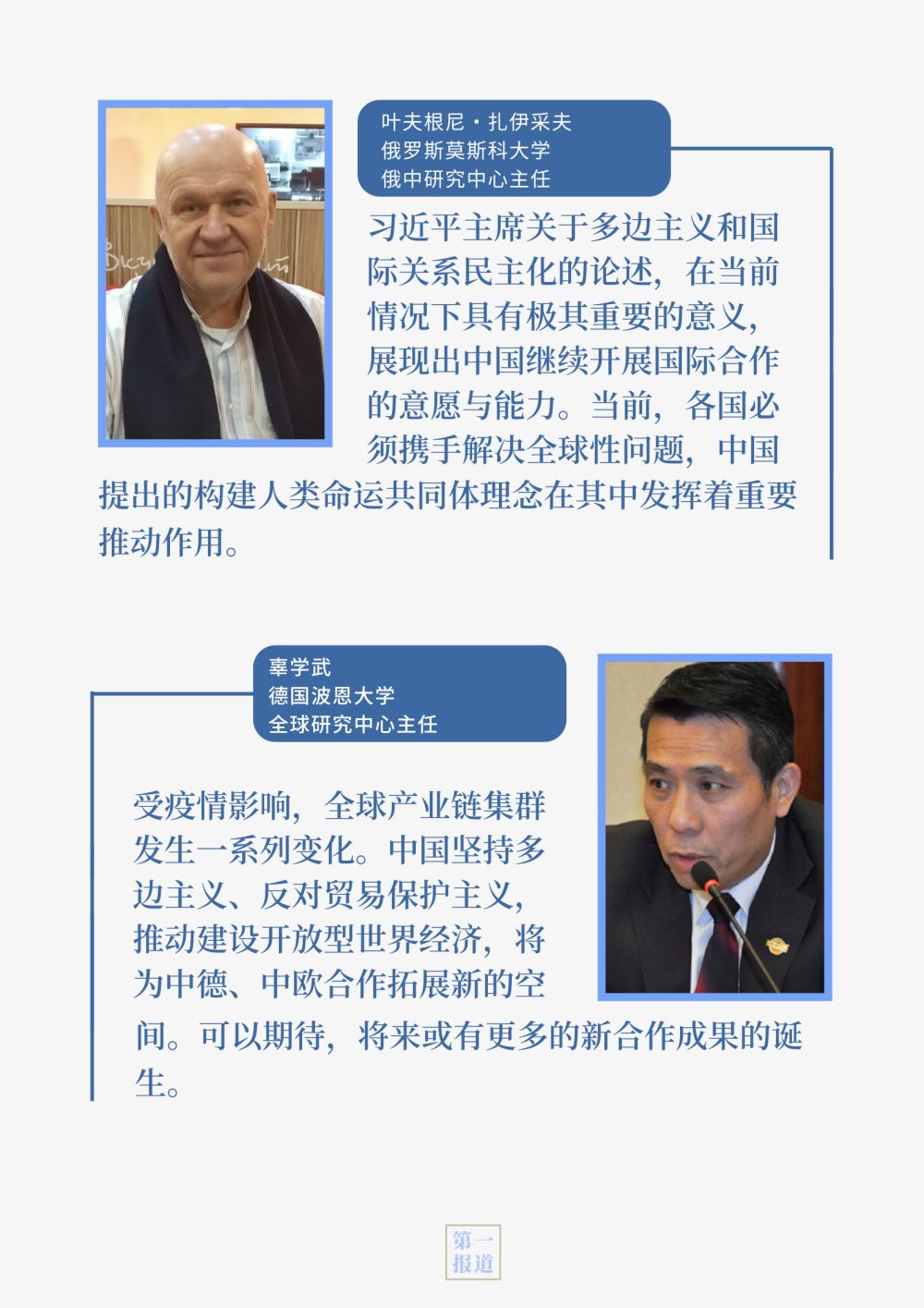 习近平强调,中国将坚持多边主义和国际关系民主化,以开放、合作、共赢胸怀谋划发展,坚定不移推动经济全球化朝着开放、包容、普惠、平衡、共赢的方向发展,推动建设开放型世界经济。