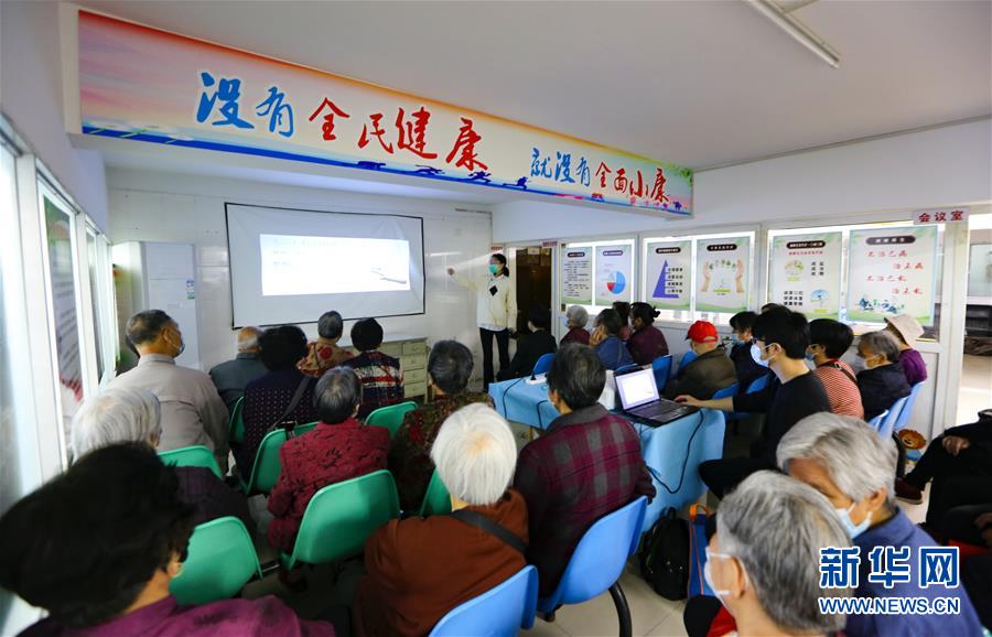 在福建省三明市三元区城关社区,来自三明市、区疾控中心和市中西结合医院、社区卫生服务中心的专业人员,与社区居委会工作人员组成医防融合团队,针对老年病开展健康教育(4月22日摄)。新华社发(三明市疾控中心供图)