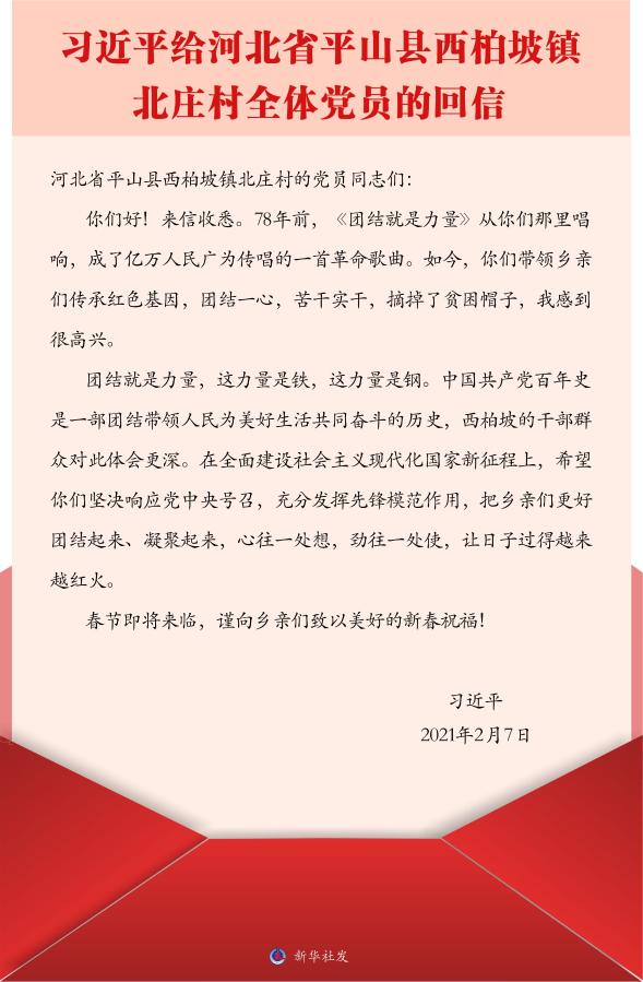 你们好!来信收悉。78年前,《团结就是力量》从你们那里唱响,成了亿万人民广为传唱的一首革命歌曲。如今,你们带领乡亲们传承红色基因,团结一心,苦干实干,摘掉了贫困帽子,我感到很高兴。
