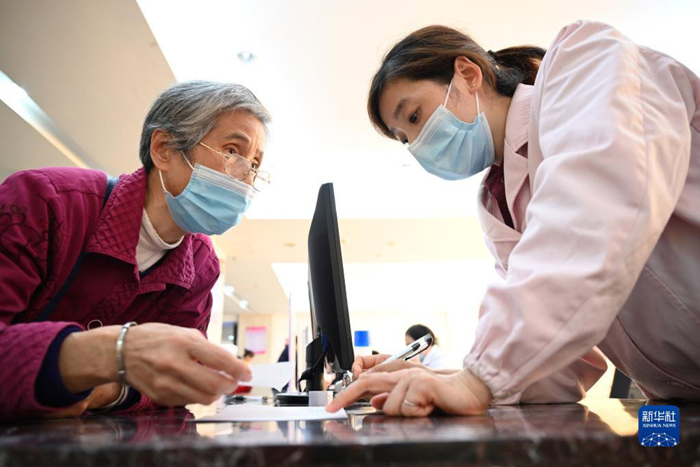 福建省三明市第一医院的医保办工作人员(右)向前来咨询药品报销问题的居民讲解相关政策(20201118日摄)。新华社记者 姜克红 摄