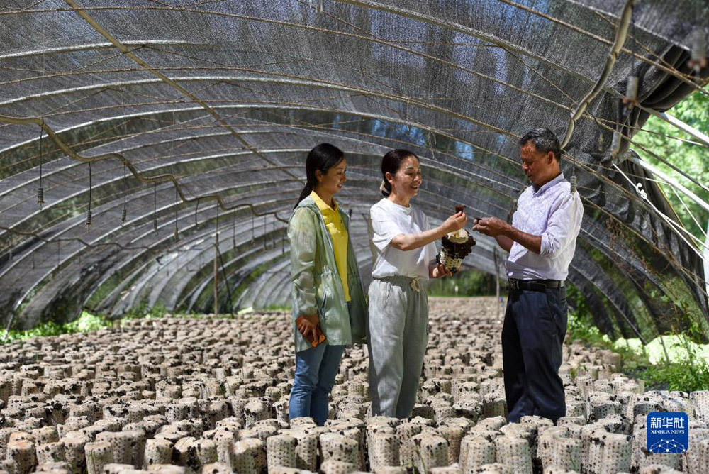 新疆维吾尔自治区党委组织部、老干部局驻托万克麦盖提村“访惠聚”工作队第一书记陈双萍(中)和工作队员来到生态园与技术员陈金生(右)查看培育的木耳(202267日摄)。新华社记者 丁磊 摄